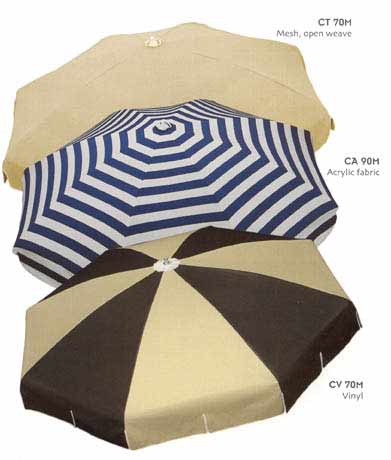 | Umbrellas The popular 4-ply Vinyl umbrella includes an ultraviolet "block-out" vinyl layer. Mesh umbrellas are made of woven vinyl-coated polyester for optimum air circulation. Acrylic fabric umbrellas feature the beautiful fabrics from Sunbrella® Each umbrella is equipped with push button tilt and manual lift. The conventional style umbrella is the perfect choice for umbrella tables. The comtemporary styling creates a clean modern look in 8 ribbed, 7 1/2 ft. diameter. |